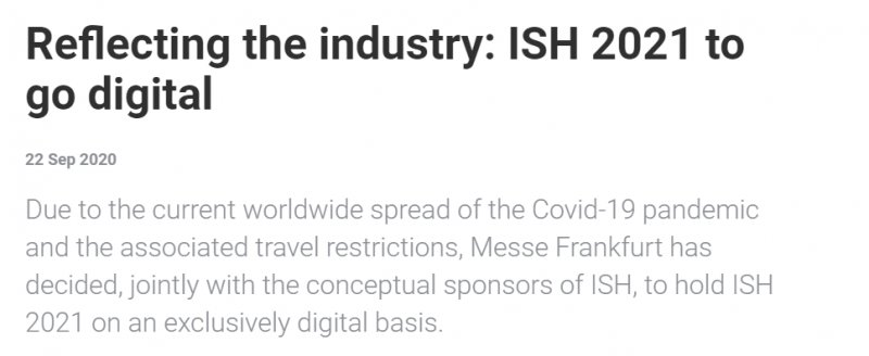 德國(guó)當(dāng)?shù)貢r(shí)間9月22日,法蘭克福暖通制冷及衛(wèi)浴展覽會(huì)(ISH)主辦方發(fā)布《ISH 2021走向數(shù)字化》公告,由于新冠大流行的影響,法蘭克福展覽公司將不會(huì)在2021年1月至3月之間的法蘭克福展覽中心舉行任何實(shí)體貿(mào)易展覽會(huì)。